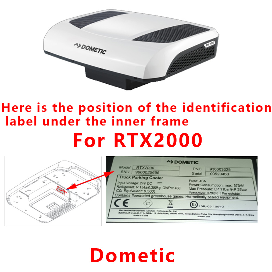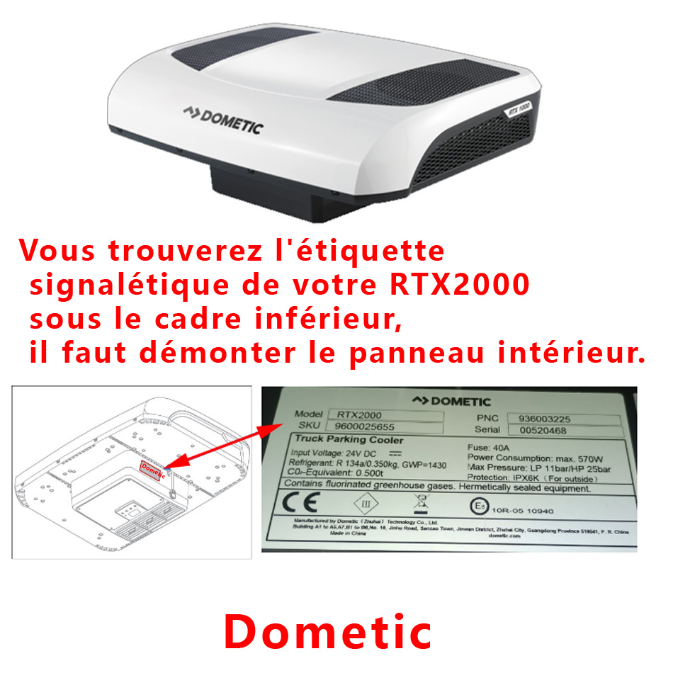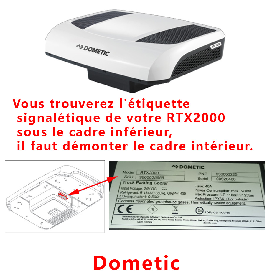 Compatible pour les appareils suivants : Vous trouverez l’étiquette signalétique de votre RTX2000, sous le cadre inférieur, voir photo, il faut démonter le cadre intérieur ou le panneau carré du kit de fixation dans la cabine.